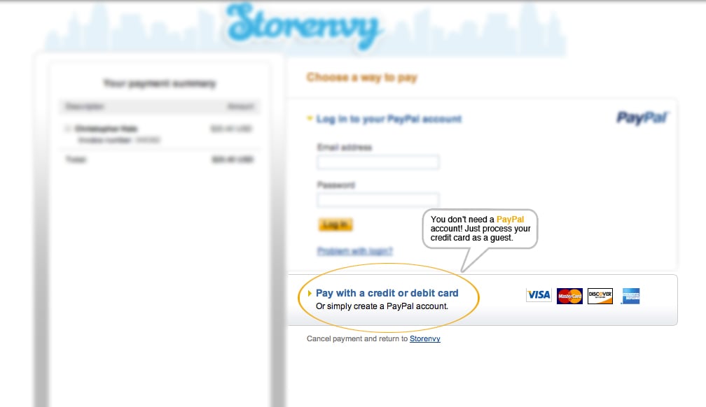 Payment Options: PayPal or PayPal Guest CC Processing. (See picture on left)